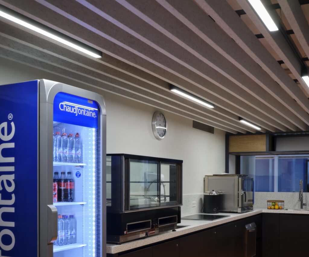 Een schoolkantine is meer dan een plek om te eten. Het is een sociale ruimte waar leerlingen en docenten elkaar ontmoeten. In het St. Michaël College zijn spots geïntegreerd in de akoestische lamellen plafond, wat zorgt voor een prettige, huiselijke sfeer. Een flexibel railsysteem met spots maakt het eenvoudig om de verlichting aan te passen aan verschillende situaties. Ook in de keuken komt deze flexibiliteit terug: langwerpige armaturen, bevestigd aan hetzelfde type railsysteem, maken het mogelijk om de verlichting precies daar te plaatsen waar deze nodig is.