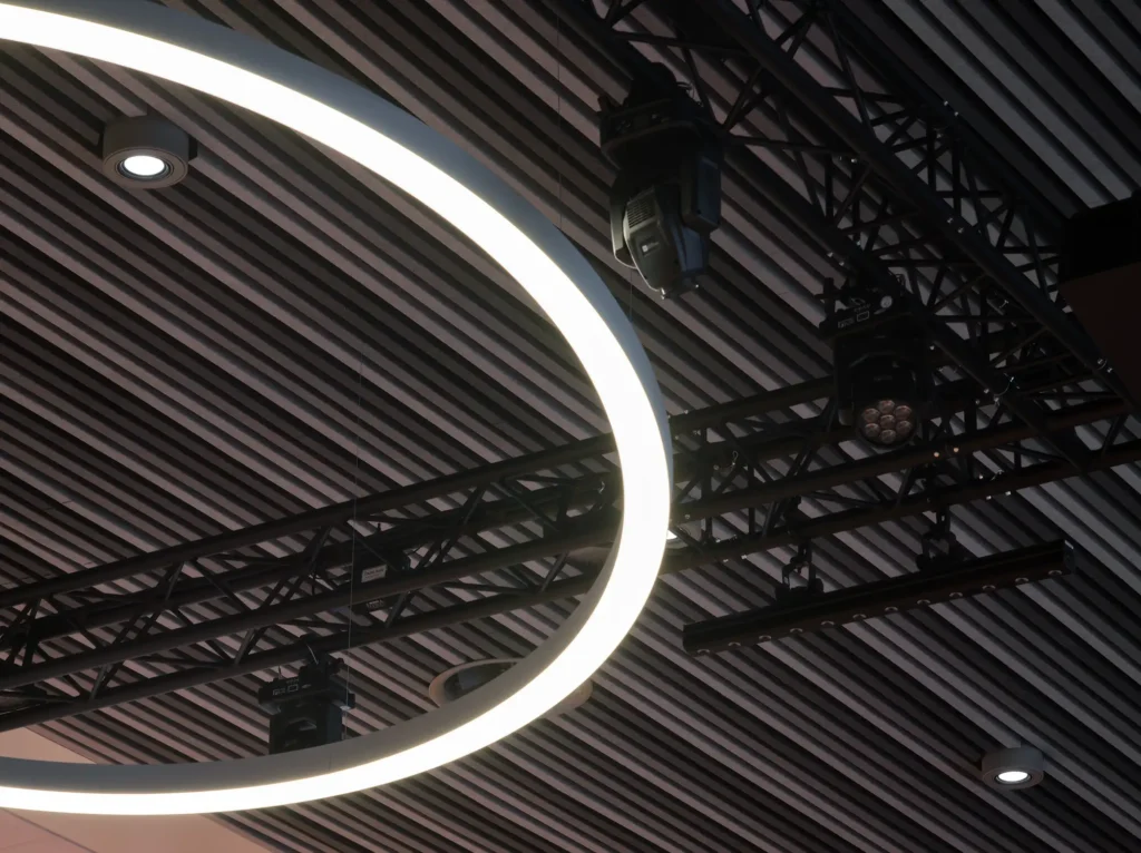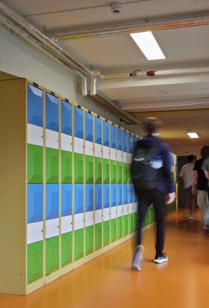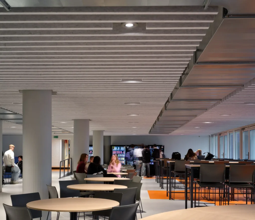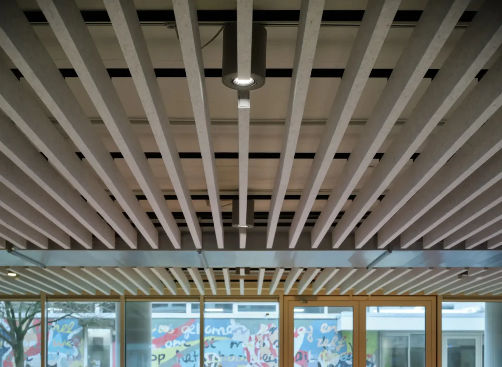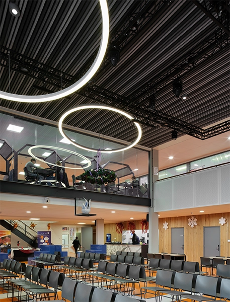 De aula vormt het centrale punt van elke school. Hier komen leerlingen samen tijdens pauzes, vinden presentaties plaats en worden feesten georganiseerd. In het St. Michaël College zorgen cirkelvormige armaturen, gecombineerd met strategisch geplaatste spots tussen de akoestische lamellen op het plafond, voor een veelzijdige ruimte. Deze combinatie maakt het mogelijk om de verlichting aan te passen aan de activiteiten – van een rustige lunchpauze tot een levendige kerstviering.